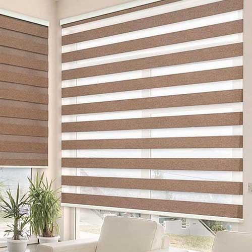 - پرده زبرا که از نوارهای یک در میان تور و پارچه تشکیل شده که به صورت موازی و افقی نسبت به هم قرار میگیرند و به دلیل همین الگوی راهراه، به آنها پرده گورخری نیز گفته میشود. حالت تناوبی شفاف و تیره این پردهها زبرا باعث میشود توانایی بالایی در کنترل نور داشته باشند